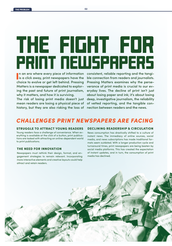 Working on the school newspaper didn’t just shape my skills, it connected me to my community in a way I had never experienced before. I learned the power of storytelling, the weight of truth, and the incredible feeling of seeing my work printed in ink, unchangeable, permanent, a piece of history. This project is more than just design. It’s a love letter to print journalism, to the newspaper that shaped me, and to the belief that good design can help save what matters!